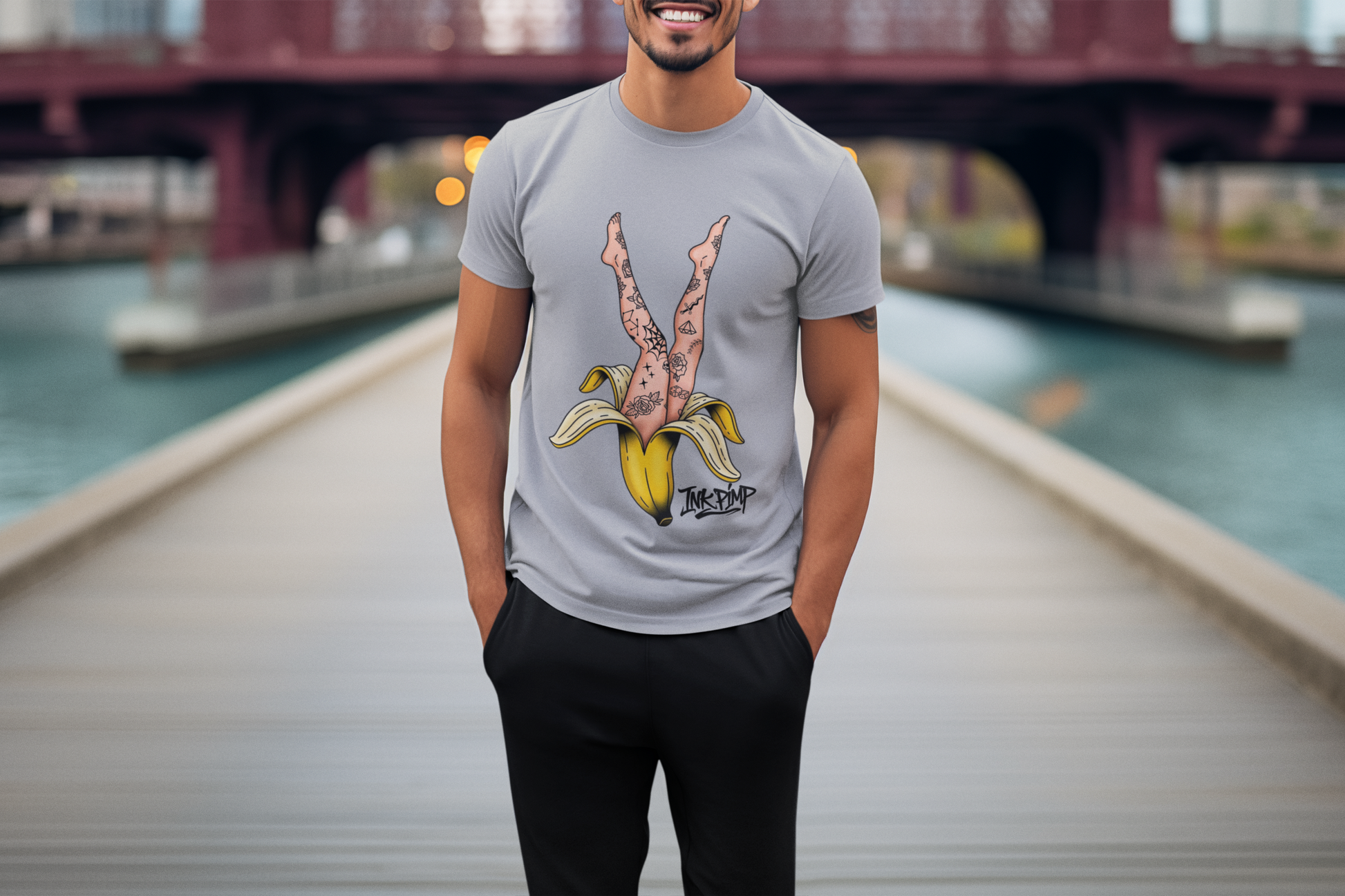 Yo, this is straight-up art meets attitude, homie. Our "Inked Up Banana Legs" tee is playful, provocative, and 100% Ink Pimp energy. We got a pair of inked-up legs popping out of a banana peel - yeah, you read that right - covered in roses, spiderwebs, dice, daggers, and all that classic tattoo flash you love.